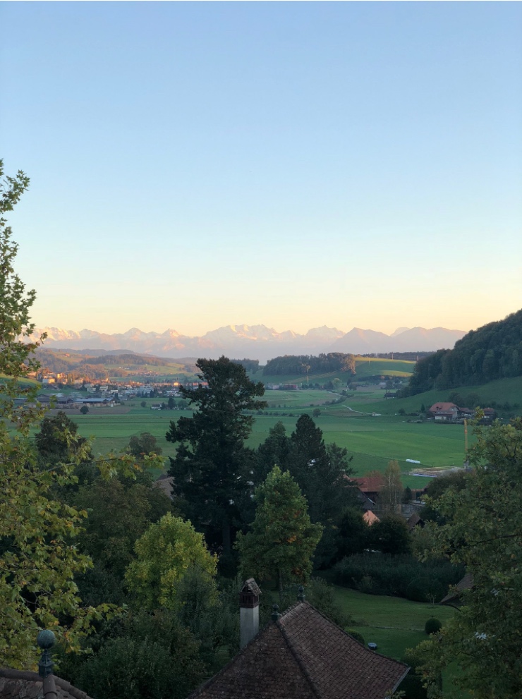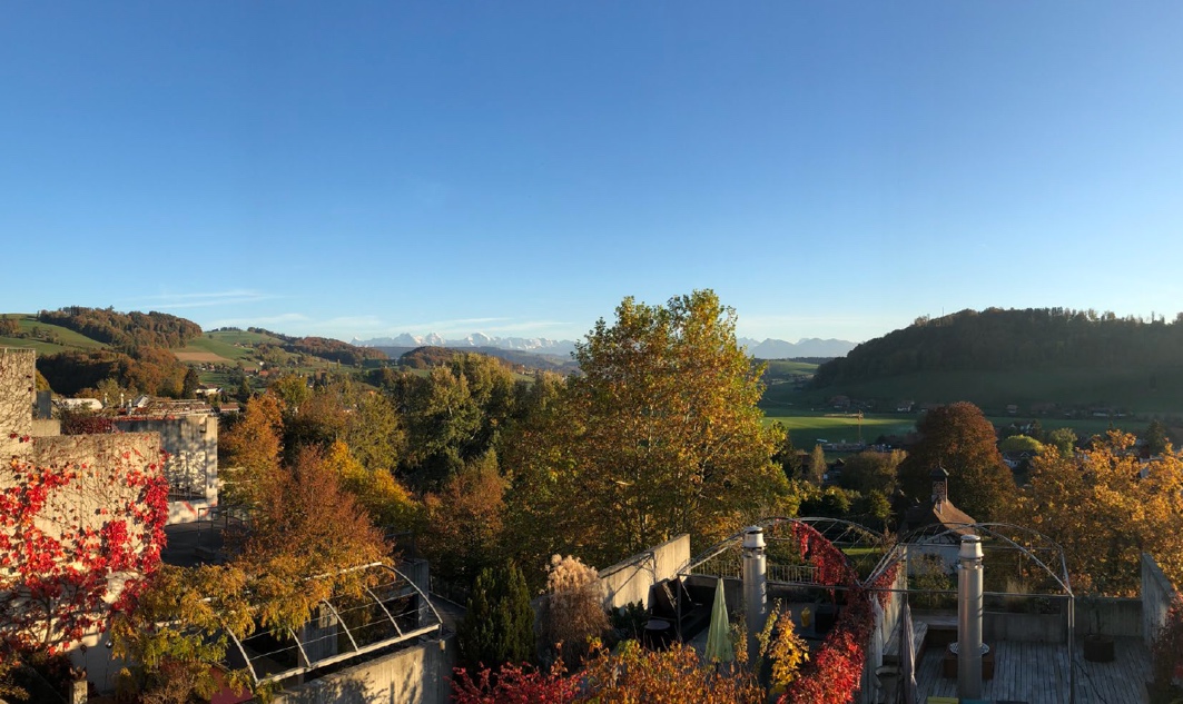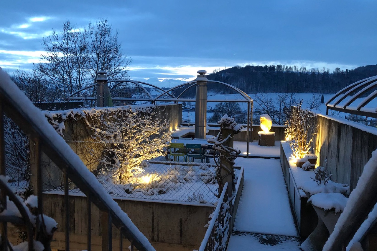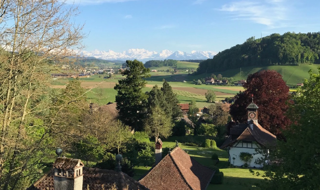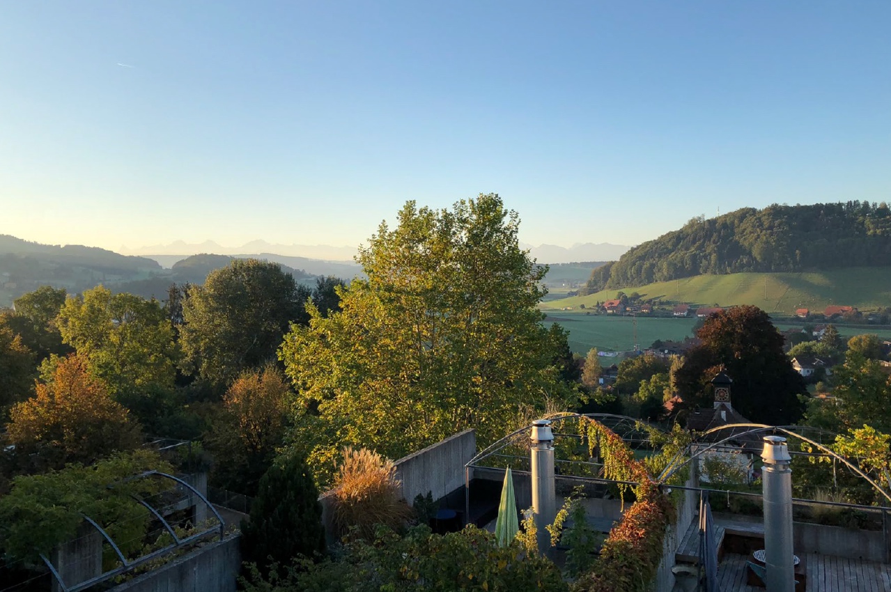 Um dessen Unterhalt zu sichern, sah sich der Eigentümer dieses kleinen Schlösschen zum Verkauf eines Teils seines Areals gezwungen. Durch eine dichte Bebauung im steilen Hang konnte der, auf einer Zwischenterrasse liegende Garten, mit seinem phantastischen Baum-bestand, erhalten werden. Das nach Süden geneigte Grundstück bietet eine grossartige, unverbaubare Aussicht über die Baumriesen des Schlossparks hinweg auf die Alpen.